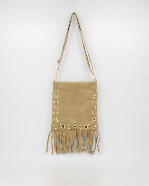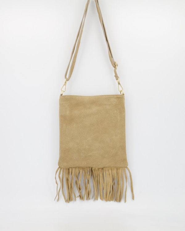 The Chelsa Suede Handbag in Beige is a chic blend of bohemian charm and practical design. Crafted from 100% premium suede leather, this crossbody bag is detailed with gold-tone hardware and playful fringe, giving it a relaxed yet sophisticated appeal.