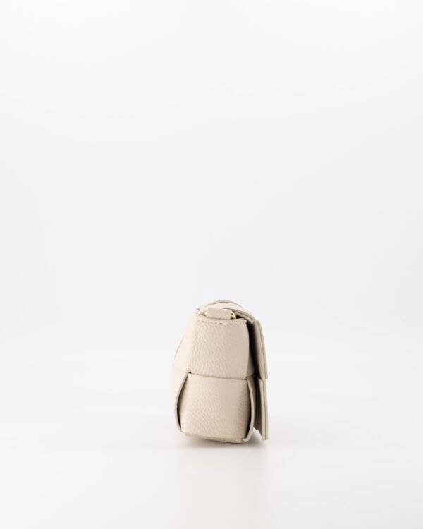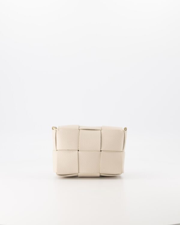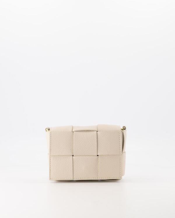The Helena bag is made of genuine leather with a padded woven pattern. The crossbody bag has a removable and adjustable strap. The Steef closes with a click closure and has an inner compartment with a zipper pocket.
