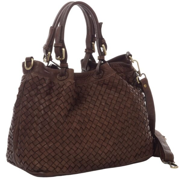 The Phoebe is meticulously crafted, blending functionality with fashion. With its generous dimensions of 35 * 15 * 28 cm, it provides ample space for all your essentials and more. The bag features a detachable, adjustable strap and two sturdy handles, allowing you to carry it in a way that best fits your style and mood. Its convenient magnetic fastening keeps your belongings secure while offering easy access. Inside, the soft cotton lining and the central zip pocket divide the space into two compartments for optimal organization. Additionally, it includes one zippered side pocket and two open pockets to keep everything neatly arranged. The unique wide weave leather detail adds a sophisticated texture to any outfit.